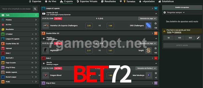 A aposta Bet72 oferece aos jogadores a experiência mais conveniente de apostas em eSports!
